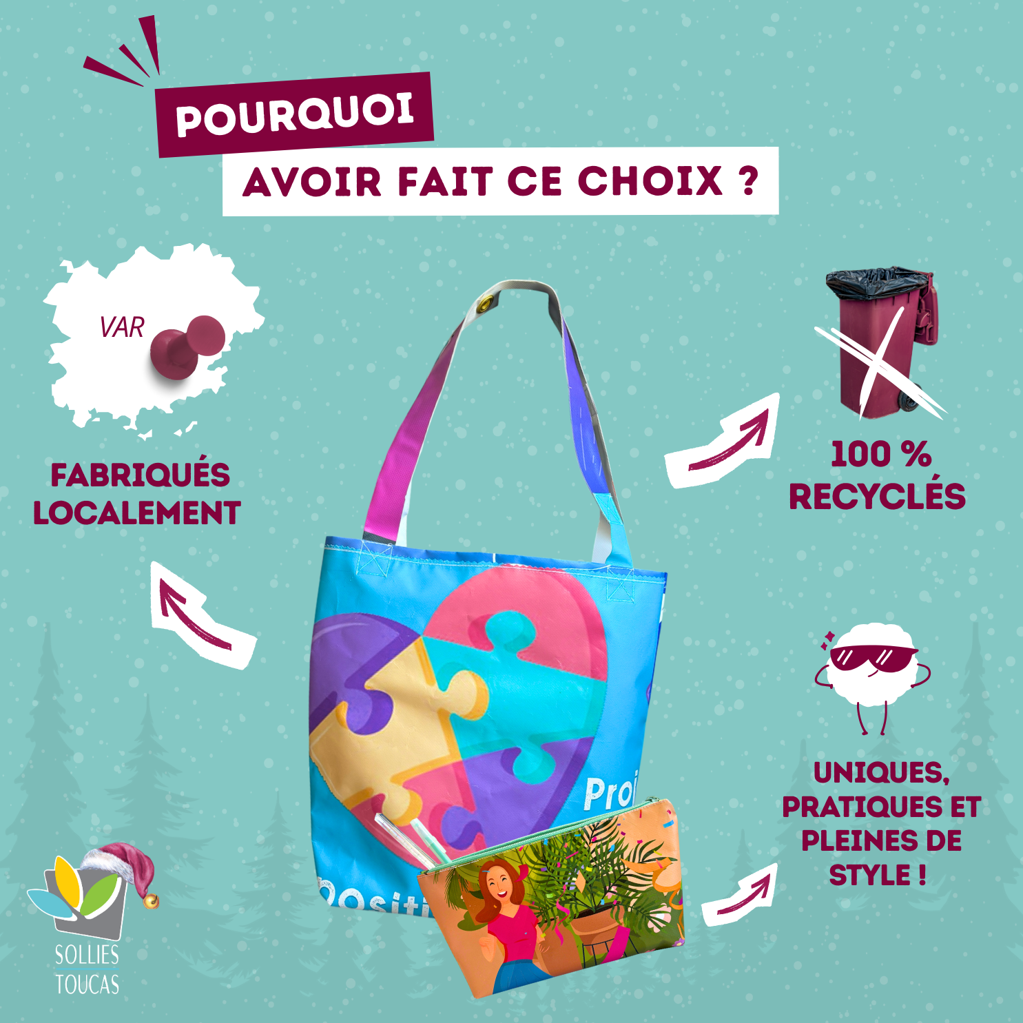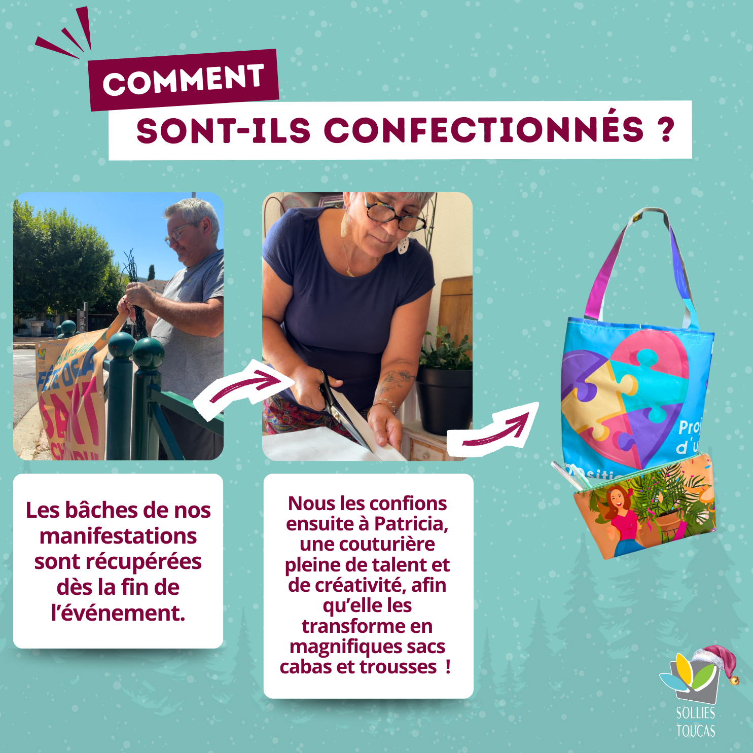 A Solliès-Toucas, les bâches utilisées lors des événements municipaux se transforment en accessoires uniques. Grâce au talent de Patricia, couturière locale, des sacs cabas et trousses 100 % recyclés et fabriqués localement sont disponibles à la vente.