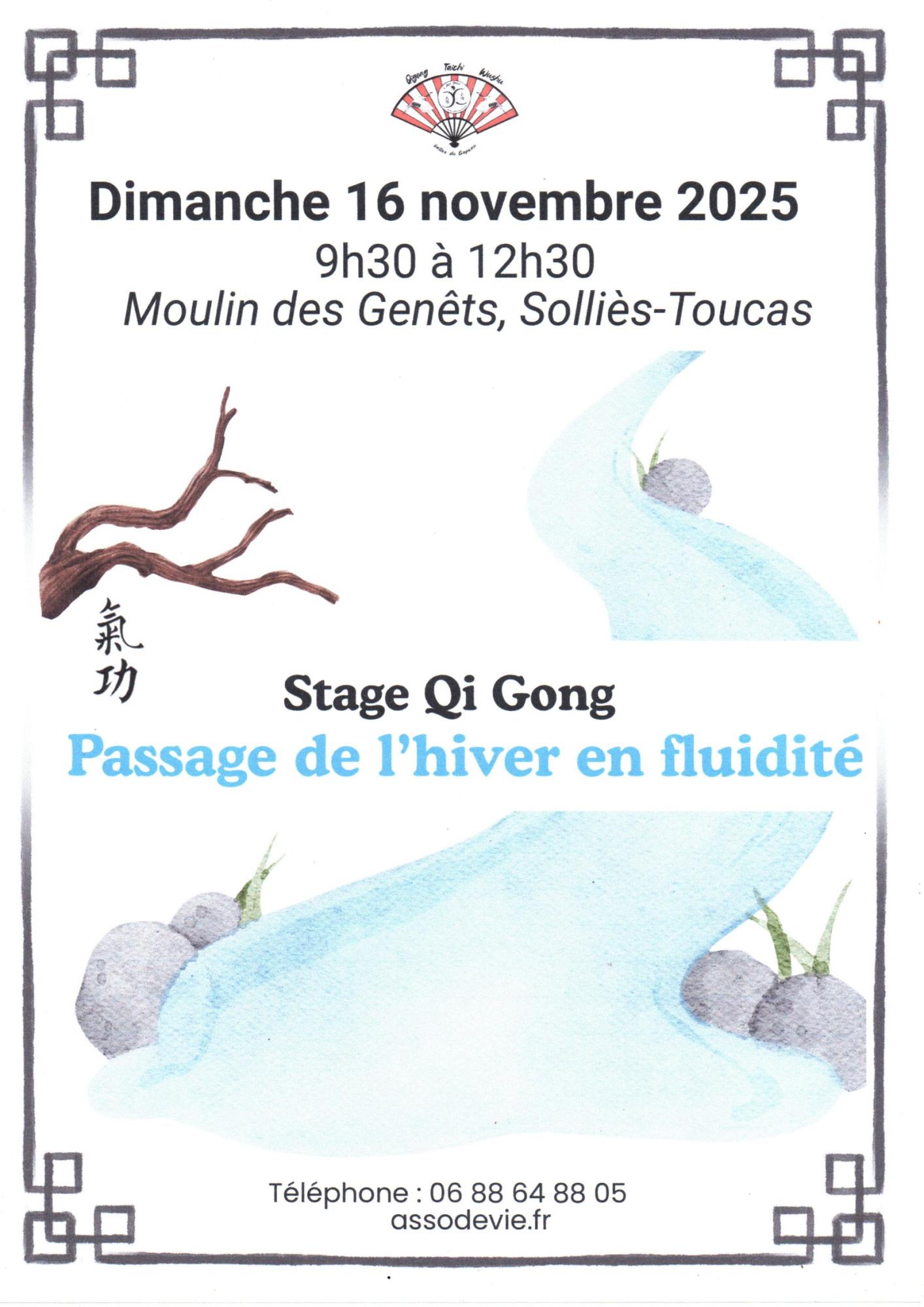 L'AssoDeVie organise un stage de Qi Gong intitulé « Passage de l'hiver en fluidité », qui aura lieu le dimanche 16 novembre 2025 à la salle de danse du Moulin des Genêts.