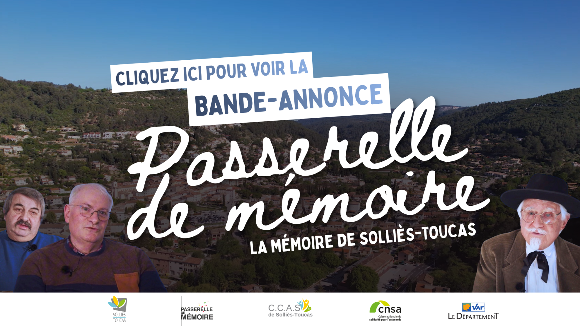Venez découvrir le film « La Mémoire de Solliès-Toucas », réalisé dans le cadre du projet Passerelle de Mémoire, le samedi 7 mars 2026 à 17h00 à la salle des fêtes (Imp. des Sœurs de la Compassion, 83210 Solliès-Toucas). Ce documentaire intergénérationnel, d’environ 50 minutes, met en lumière la mémoire vivante du village et retrace la vie des Toucassins entre 1940 et aujourd’hui, à travers les témoignages poignants d’une vingtaine d’habitants.