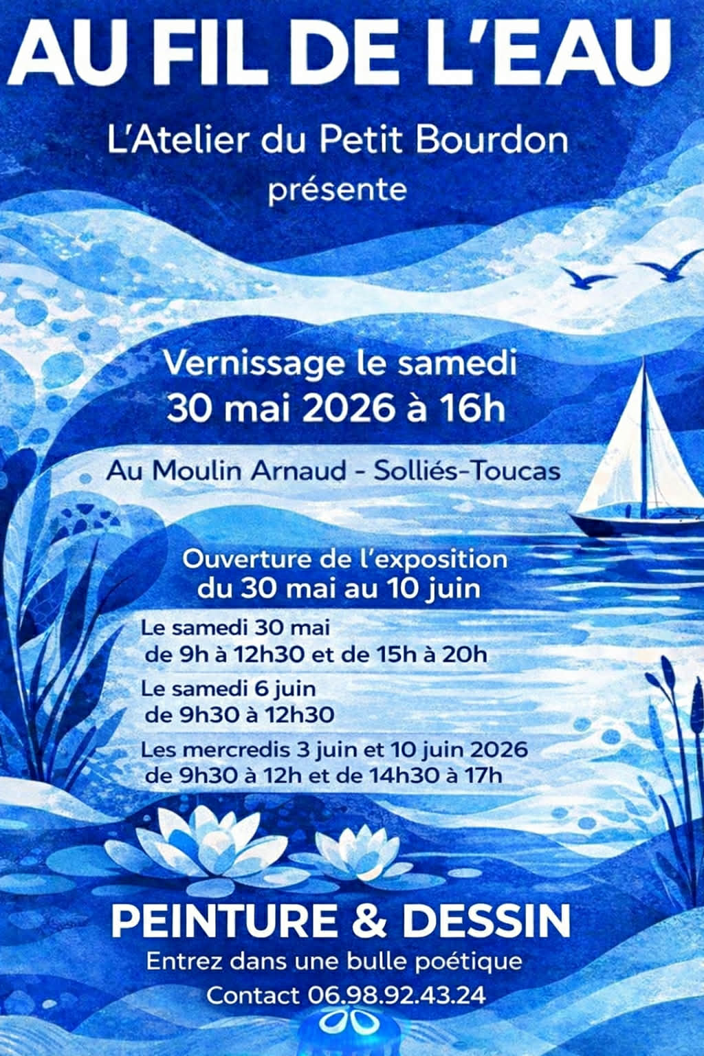 L’atelier du Petit Bourdon vous invite à découvrir son exposition de peinture et de dessin intitulée « Au fil de l’eau », qui se tiendra du 30 mai au 10 juin 2026 au Moulin Arnaud.