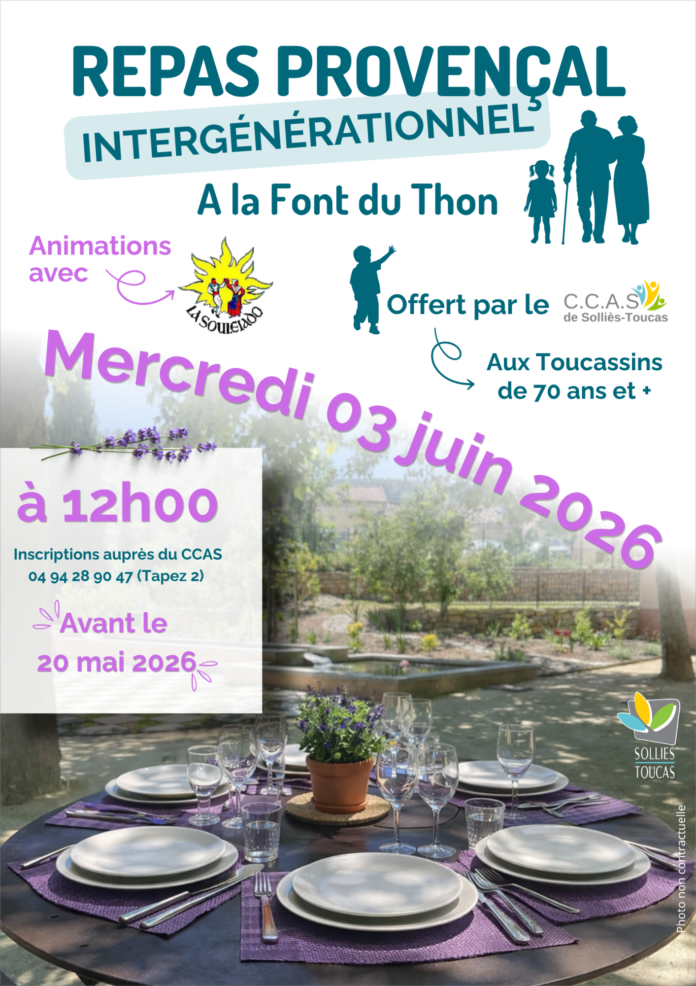 Le CCAS vous invite à un repas provençal intergénérationnel, organisé à la Font du Thon le mercredi 3 juin 2026 à 12h00.